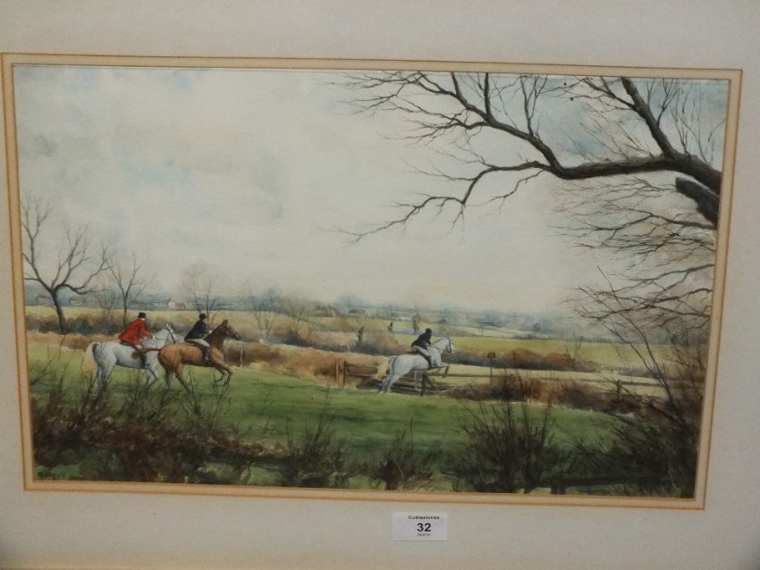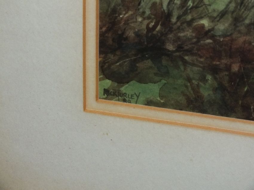 A GILT FRAMED AND GLAZED WATERCOLOUR DEPICTING A HUNTING SCENE SIGNED 'NICK TURLEY' 30 X 45 CM