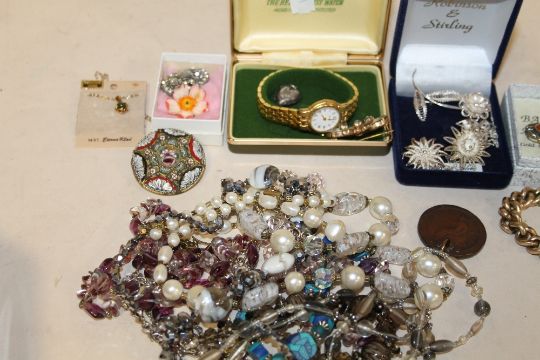 A TRAY OF COSTUME JEWELLERY TO INCLUDE A MICRO MOSAIC BROOCH, 9 CT GOLD WATCH ETC.