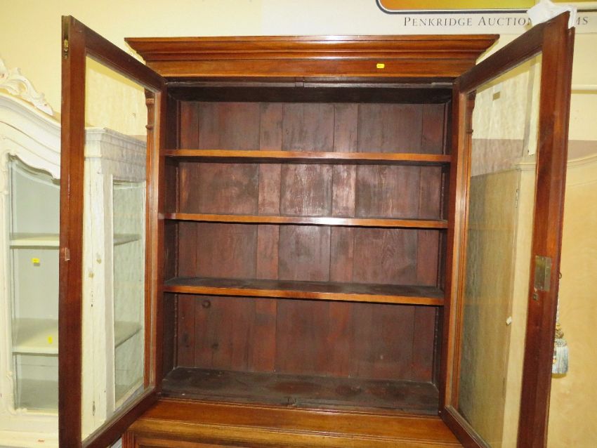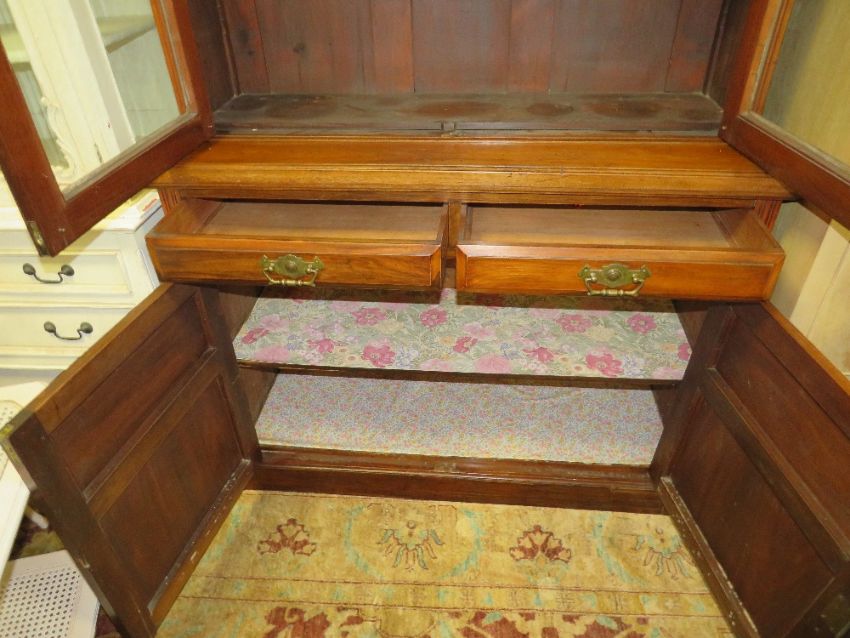 AN EDWARDIAN MAHOGANY CARVED GLAZED BOOKCASE WITH DRAWERS AND CUPBOARDS TO THE BASE H-219 W-121 CM