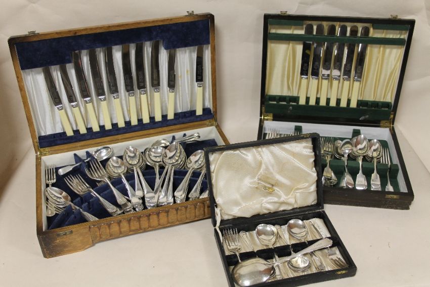 TWO PART CASED CANTEENS OF CUTLERY TOGETHER WITH A CASED SET OF SPOONS AND FORKS (3)