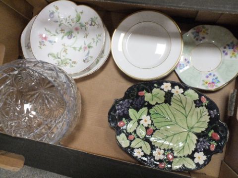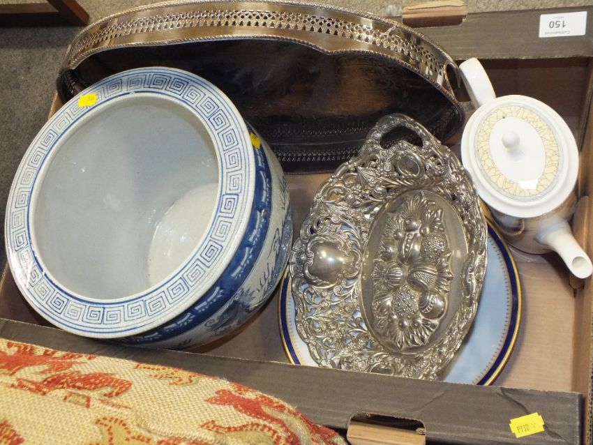 TWO TRAYS OF CERAMICS AND GLASS TO INCLUDE AN ORIENTAL STYLE BLUE AND WHITE FISHBOWL, WEDGWOOD, SPODE ETC. TOGETHER WITH TWO SILVER PLATED TRAYS