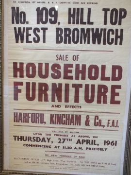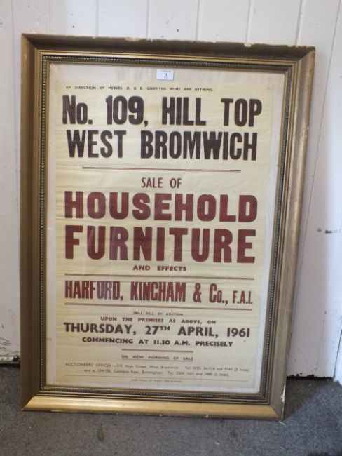 A VINTAGE GILT FRAMED AND GLAZED AUCTION ADVERTISING POSTER - NO.109 HILL TOP WEST BROMWICH SALE OF HOUSEHOLD FURNITURE HARFORD KINGHAM AND CO DATED 1961 OVERALL SIZE INCLUDING FRAME - 92CM X 66CM