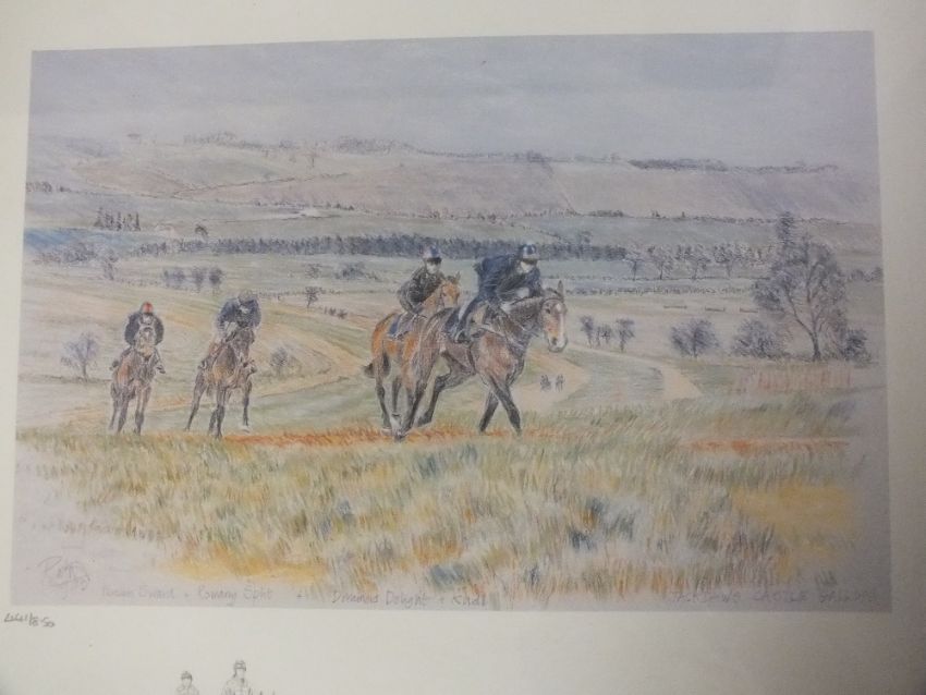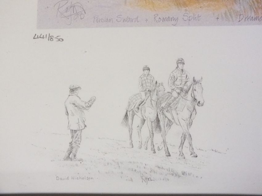 A FRAMED AND GLAZED SIGNED LIMITED EDITION PRINT ENTITLED 'JACKDAWS CASTLE GALLOPS' BY RAFNA HAMNEY 441 / 850