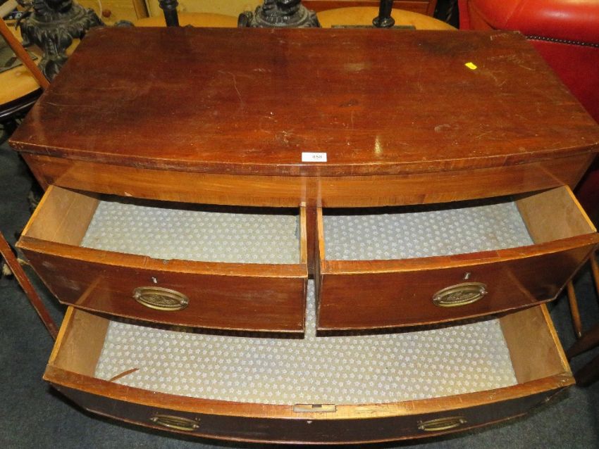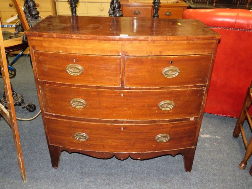 AN ANTIQUE MAHOGANY BOW FRONTED CHEST OF FOUR DRAWERS H-98 W-101 CM A/F