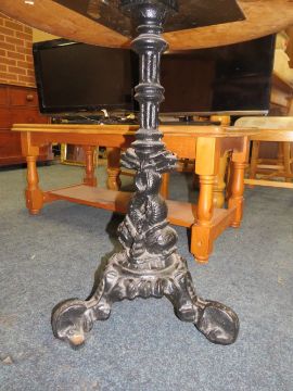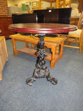 A PUB CAST IRON PEDESTAL TABLE WITH CIRCULAR MAHOGANY TOP H-70 CM DIA. 67 CM