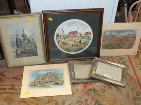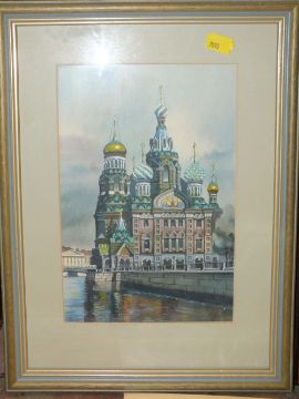 A FRAMED AND GLAZED WATERCOLOUR OF THE CATHEDRAL OF RESURRECTION ST PETERSBURG TOGETHER WITH A LIMITED EDITION MARK DENMAN PRINT, PAIR OF PICTURE FRAMES ETC (6)