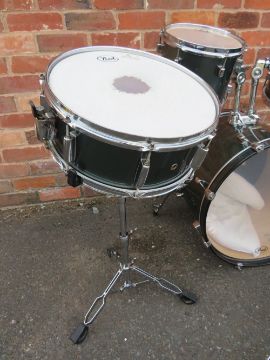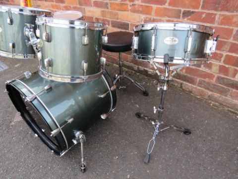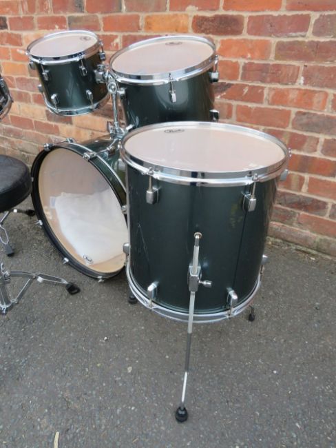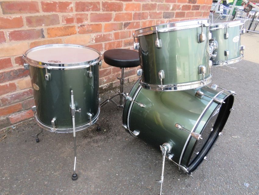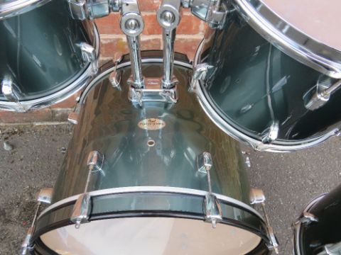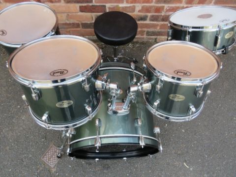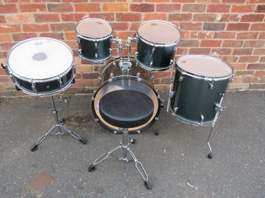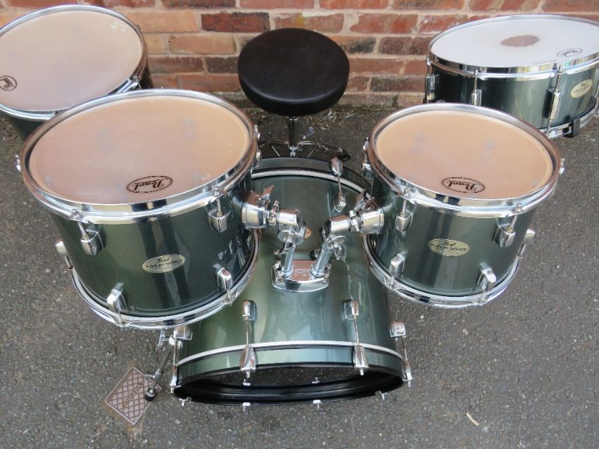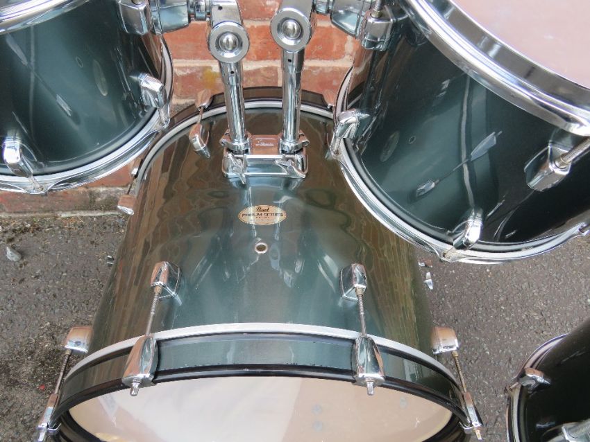 A PEARL FORUM SERIES DRUM KIT - SET TO INCLUDE BASS DRUM, FLOOR TOM, MID TOM, HIGH TOM, SNARE WITH STAND AND SEAT, please note bass drum skin has a small tear