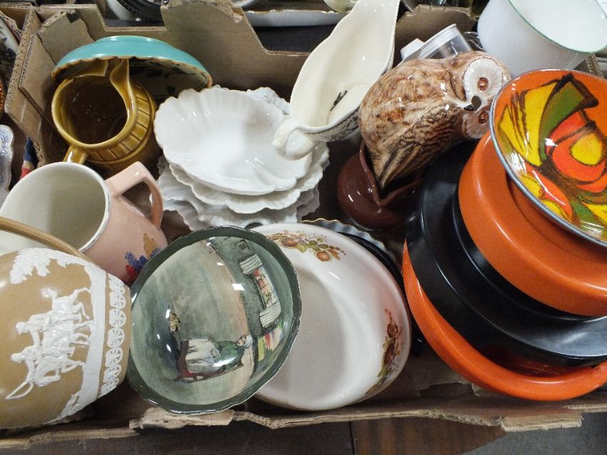 TWO TRAYS OF ASSORTED CERAMICS TO INCLUDE POOLE, ROYAL DOULTON, GOUDA ETC.