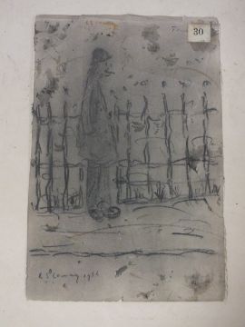 AFTER LAURENCE STEPHEN LOWRY STREET SCENE WITH FIGURE BY RAILINGS, BEARS SIGNATURE AND DATE 1956 LOWER LEFT - PENCIL ON PAPER UNFRAMED
