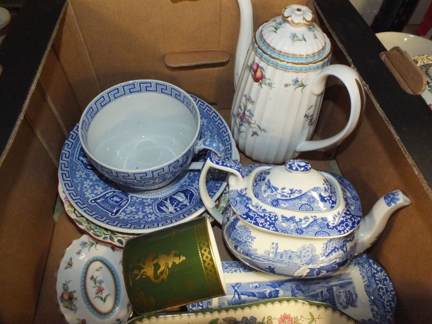 A TRAY OF SPODE CERAMICS TO INCLUDE A LARGE BLUE ROOM 'GREEK' PATTERN CUP AND SAUCER ETC.