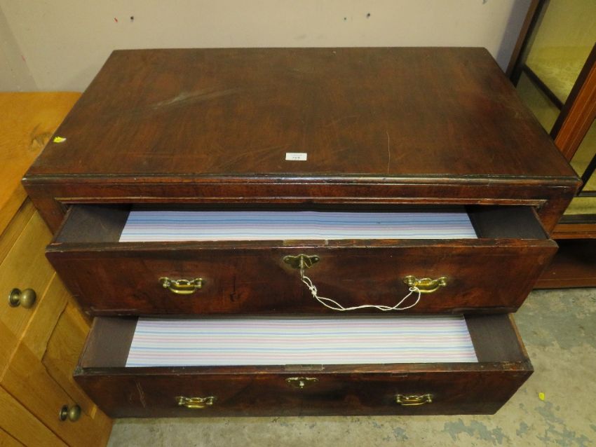 AN ANTIQUE THREE DRAWER CHEST OF DRAWERS, H 93 W 103 CM - rear foot / support missing