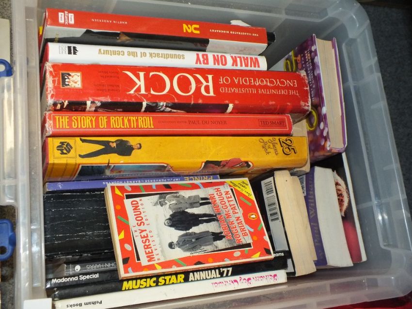 A BOX OF MUSIC RELATED BOOKS TO INCLUDE THE ROLLING STONES, U2 ETC.