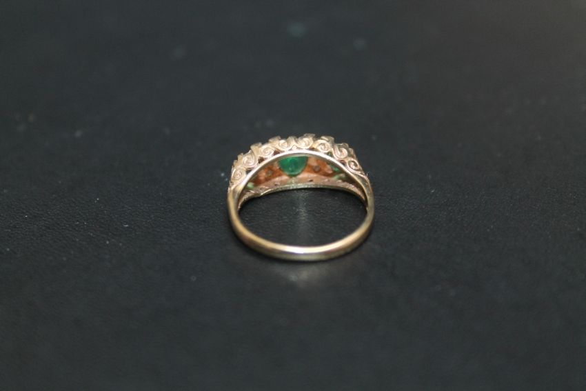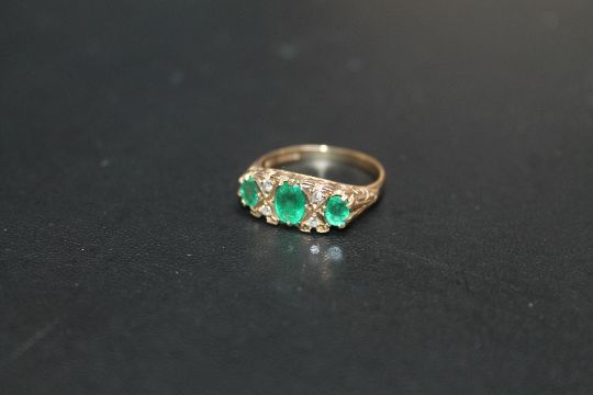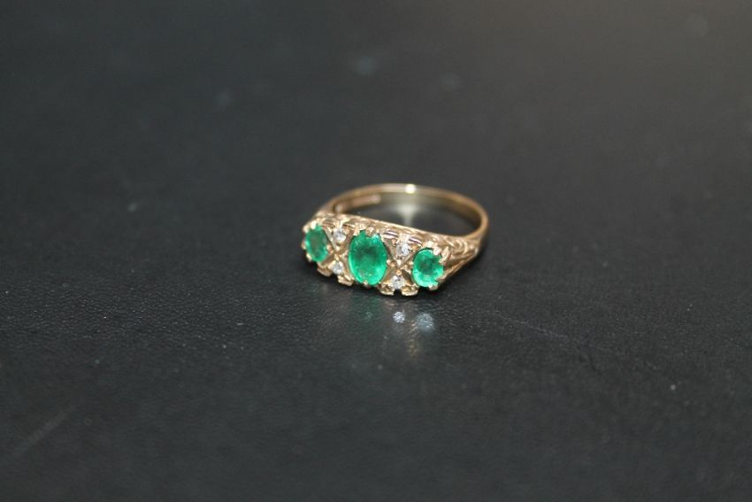 A HALLMARKED 9 CARAT GOLD THREE STONE EMERALD AND DIAMOND RING, approx weight 2.5g, ring size L