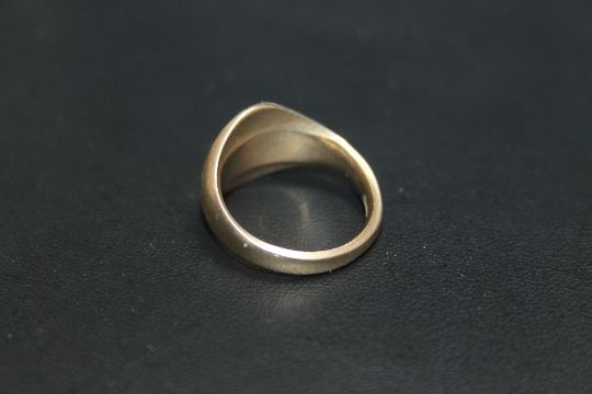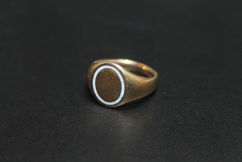 A 9CT GOLD AND ENAMEL SIGNET RING, marks rubbed, approx weight 7.2g, ring size N