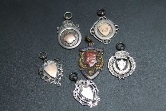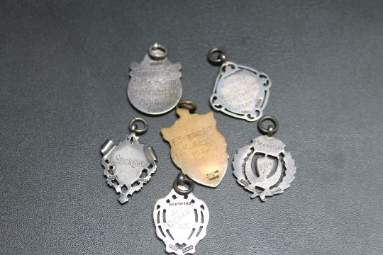 A COLLECTION OF FIVE SILVER FOB MEDALS, together with a enamelled brass example, all awarded to E Seabright in 1919/1920's for athletics (6)