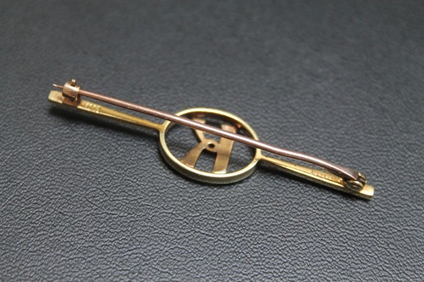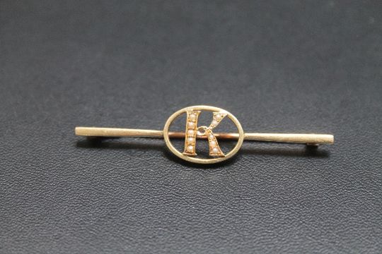 A 15CT GOLD BAR BROOCH WITH SEED PEARL 'K', central seed pearl missing, approx weight 4.3g, W 5.5 cm