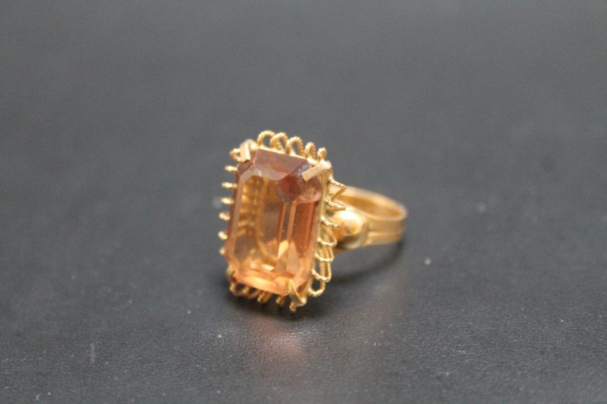 A CONTINENTAL C18 GOLD CITRINE RING, in high gallery setting, ring size P
