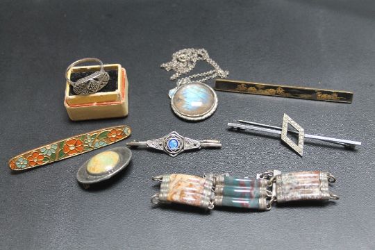 A SMALL COLLECTION OF SILVER AND COSTUME JEWELLERY, to include a Ruskin style brooch