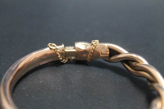 A GOLD AND COPPER BANGLE, having old repair with the three strand intertwined upper section having a 9ct stamp and the plain rear section being copper.