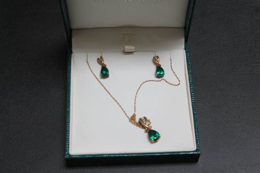 A HALLMARKED 9 CARAT GOLD EMERALD AND DIAMOND NECKLACE AND EARRINGS SET, pendant H 2 cm