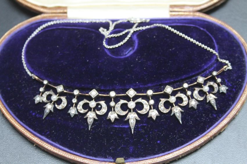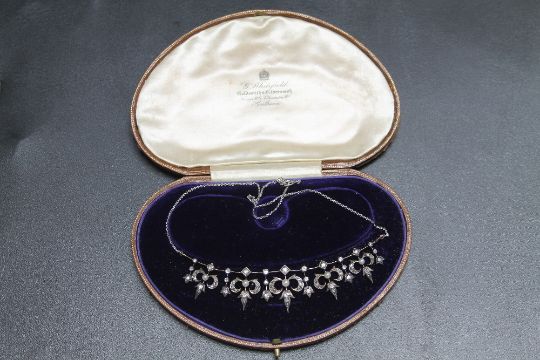 A DIAMOND AND SEED PEARL ANTIQUE NECKLACE, in fitted case.