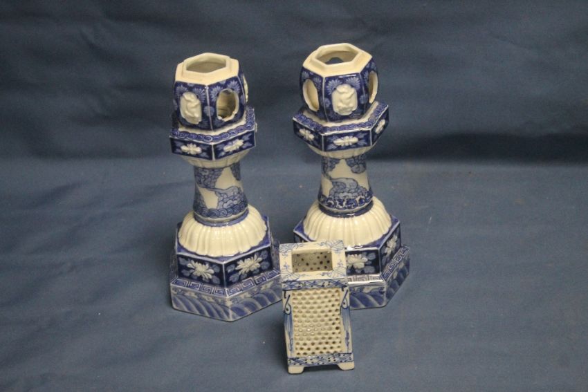 A PAIR OF BLUE AND WHITE CANDLE HOLDERS TOGETHER WITH ANOTHER