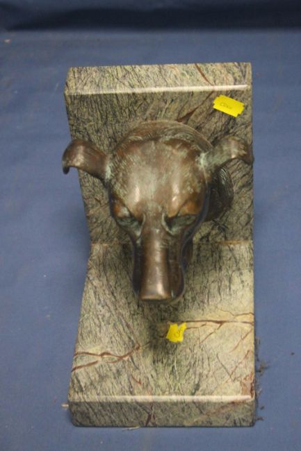A BRONZE SCULPTURE OF A DOGS HEAD MOUNTED ON A MARBLE STAND