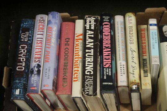 A TRAY OF MAINLY WWII BOOKS TO INCLUDE MANY ON CODE BREAKING (TRAY NOT INCLUDED)