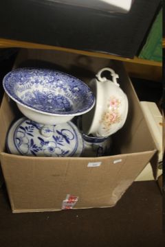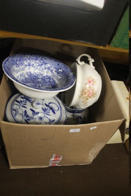 A TRAY OF CERAMICS TO INCLUDE TWO LARGE BLUE AND WHITE STORAGE JARS (TRAYS NOT INCLUDED)