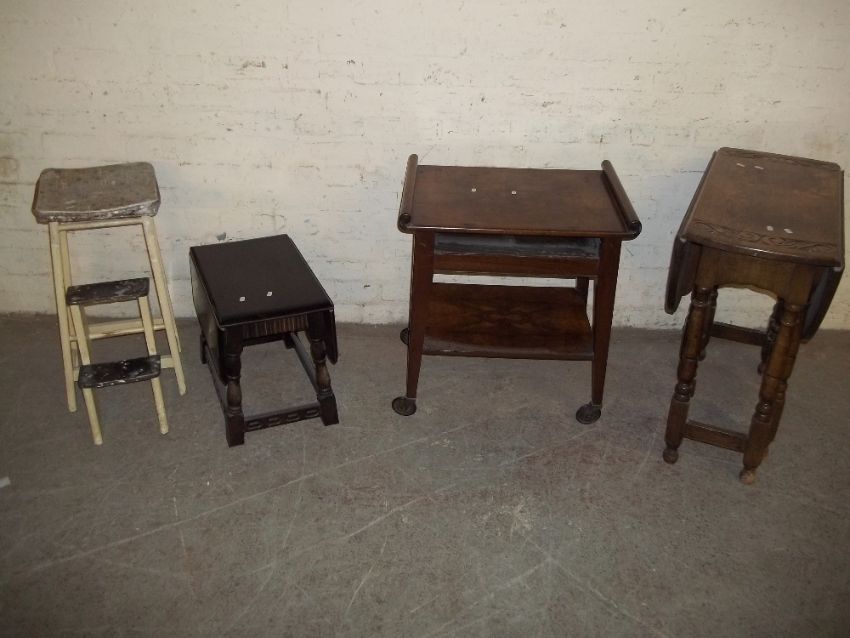FOUR ITEMS TO INCLUDE AN OAK CARVED DROPLEAF TABLE, AN OCCASIONAL PRIORY STYLE DROPLEAF TABLE, A SERVING TROLLEY AND A WOODEN STEP A STOOL