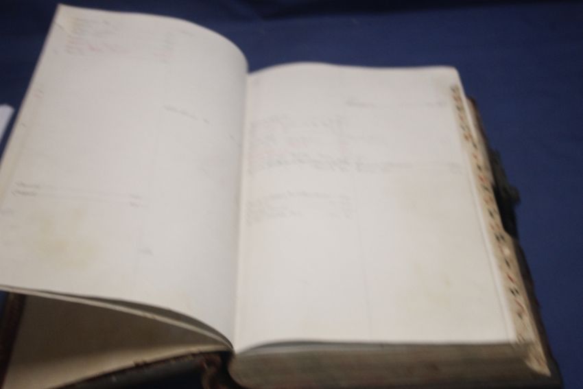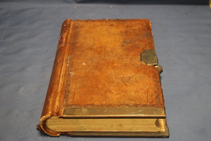 AN ANTIQUE LEATHER BOUND LEDGER WITH BRASS LOCK