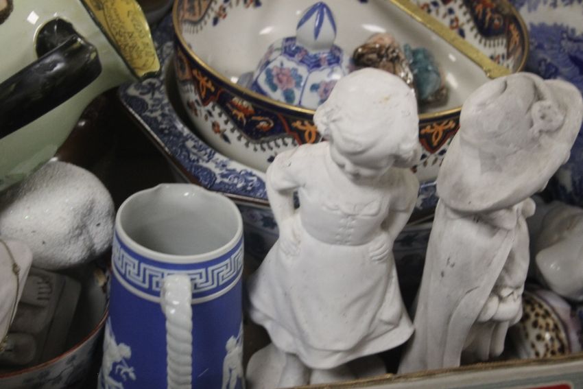 A TRAY OF ASSORTED CERAMICS TO INCLUDE BLUE AND WHITE (TRAYS NOT INCLUDED)