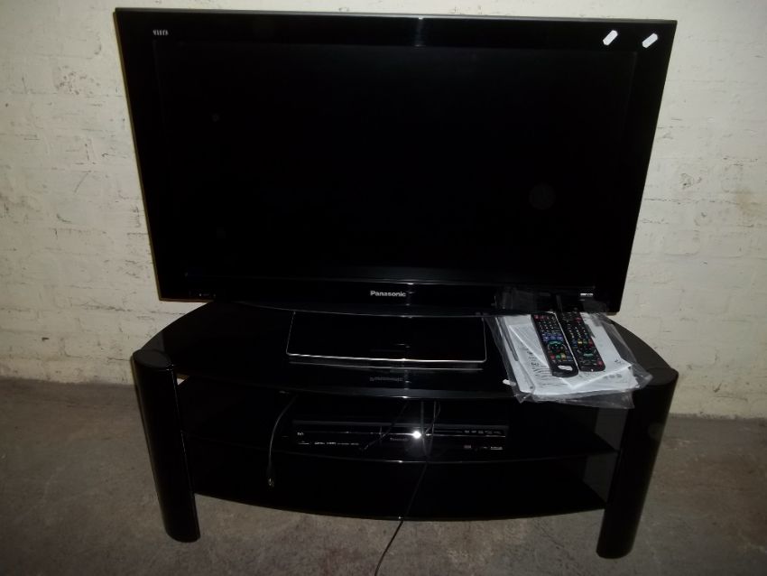 A PANASONIC TV TOGETHER WITH STAND AND A DVD PLAYER