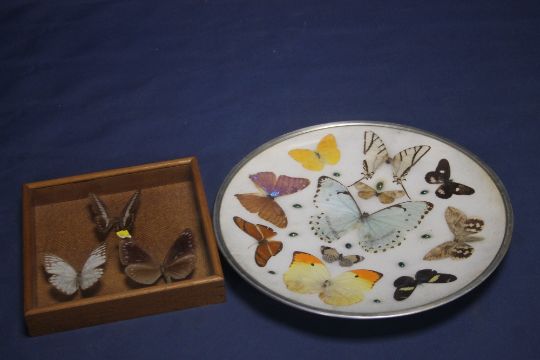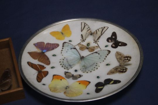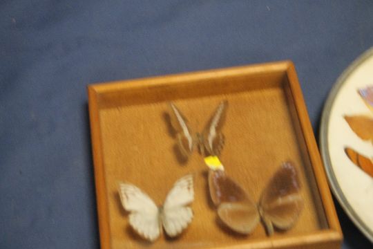 A PLATE DECORATED WITH BUTTERFLIES TOGETHER WITH 3 CASED BUTTERFLIES