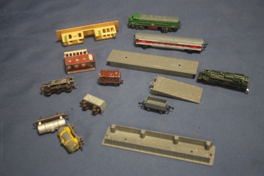 A VINTAGE 'LONE STAR' TRAIN SET to include platform and building, signal box, three locomotives (two steam), rolling stock and carriage