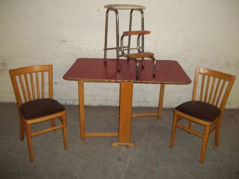 A RETRO FORMICA GATE LEG DROP LEAF KITCHEN TABLE, WITH 2 CHAIRS AND A CHROME STEP STOOL