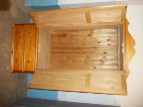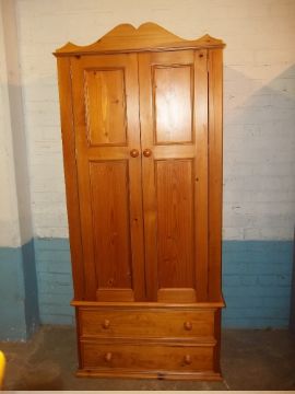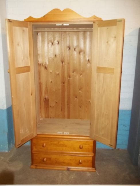 SOLID PINE DOUBLE WARDROBE AND A NARROW 4 DRAWER CHEST OF DRAWERS