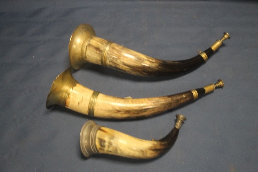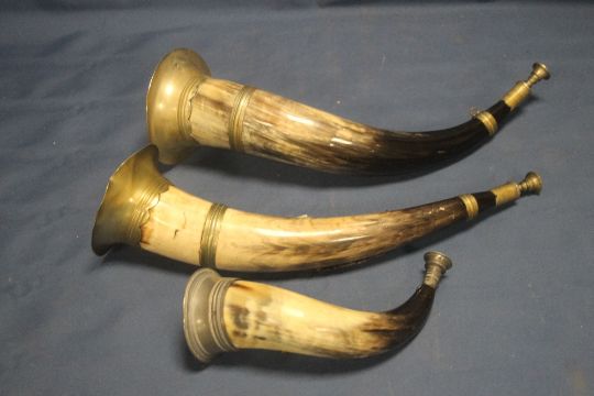 A PAIR OF 19TH CENTURY CEREMONIAL COW HORNS. EACH WITH THE BADGE OF THE |ANCIENT ORDER OF FORRESTERS| ALONG WITH A SMALLER EXAMPLE (3)