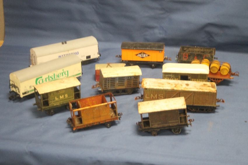 TWELVE CARRIAGES AND ROLLING STOCK, to include tin plate and plastic examples (Boxes and trays not included)