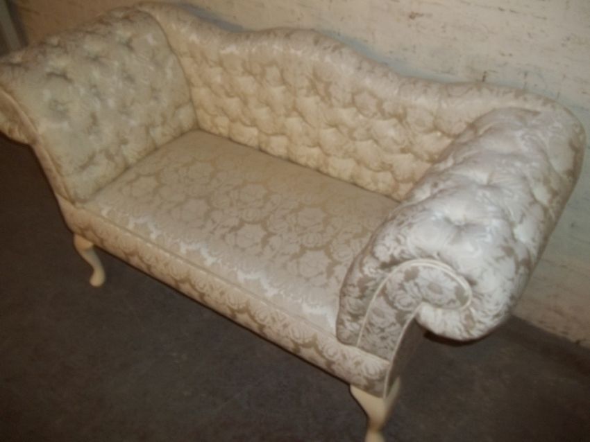 A MODERN WINDOW DEEP BUTTONED PLEATED WINDOW LOUNGE SEAT SOFA ON CABRIOLE SUPPORTS IN DAMASK FABRIC