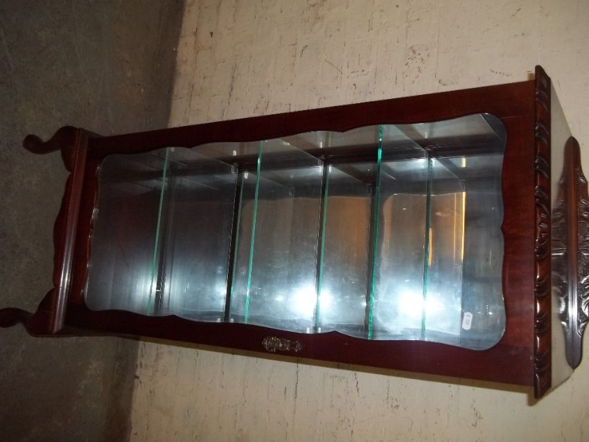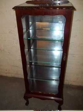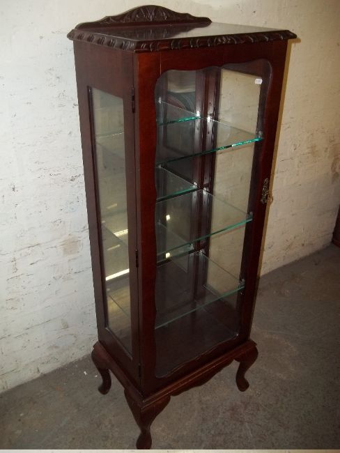 A MODERN GLAZED NARROW DISPLAY CABINET WITH CABRIOLE SUPPORTS