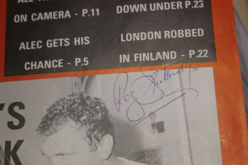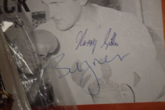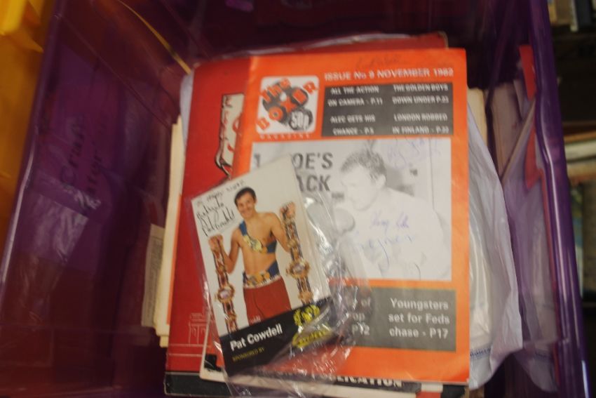 BOXING- A BOX OF NEWSPAPERS, SCRAPBOOK, AND OTHER EPHEMERA TO INCLUDE 1982 |THE BOXER| MAGAZINE SIGNED BY JOE BUGNER, HARRY GIBBS, KEITH WALLACE, ETC AND TWO CARDS SIGNED BY PAT COWDELL