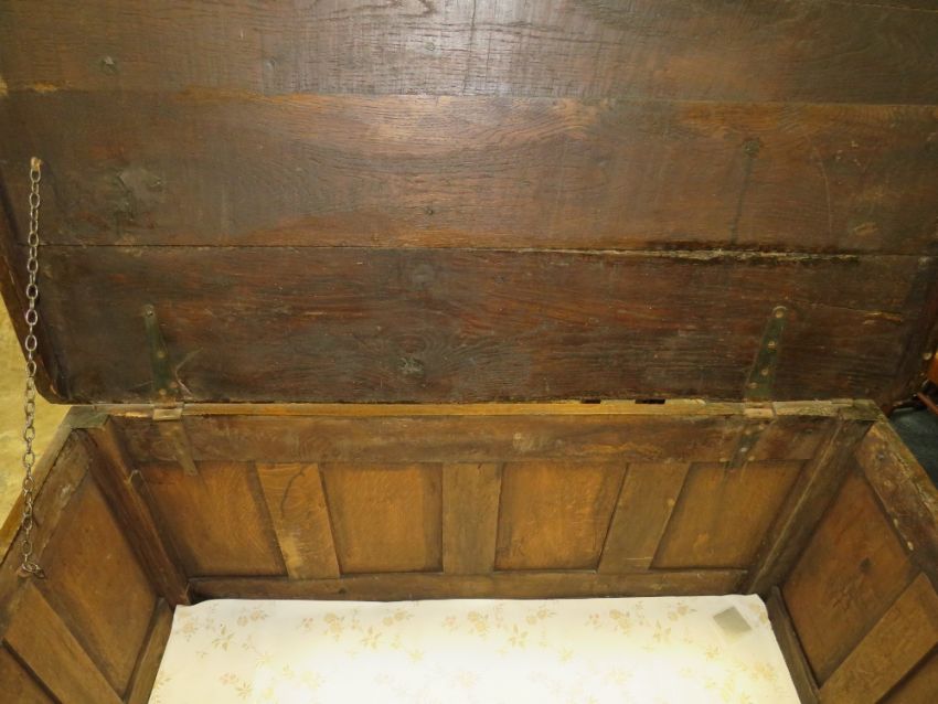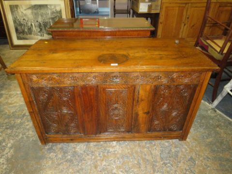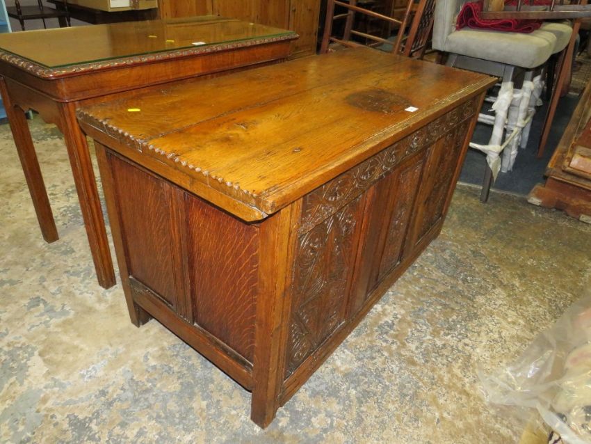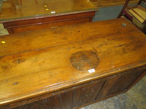AN ANTIQUE CARVED OAK TRIPLE PANEL COFFER W-122 CM