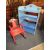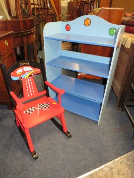 A CHILDS BLUE BOOKCASE A ROCKING CHAIR AND A NEST OF TABLES