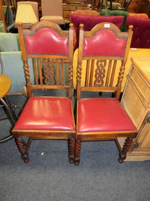 A PAIR OF OAK BARLEYTWIST UPHOLSTERED DINING CHAIRS