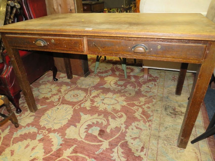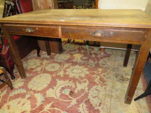 A VINTAGE OAK OFFICE TWO DRAWER DESK W-135 CM