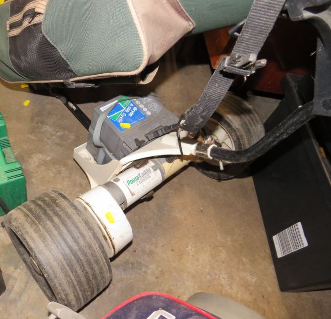 TWO SETS OF GOLF CLUBS AND BAGS, TOGETHER WITH A POWAKADDY CLASSIC GOLF TROLLEY AND VARIOUS CHARGERS