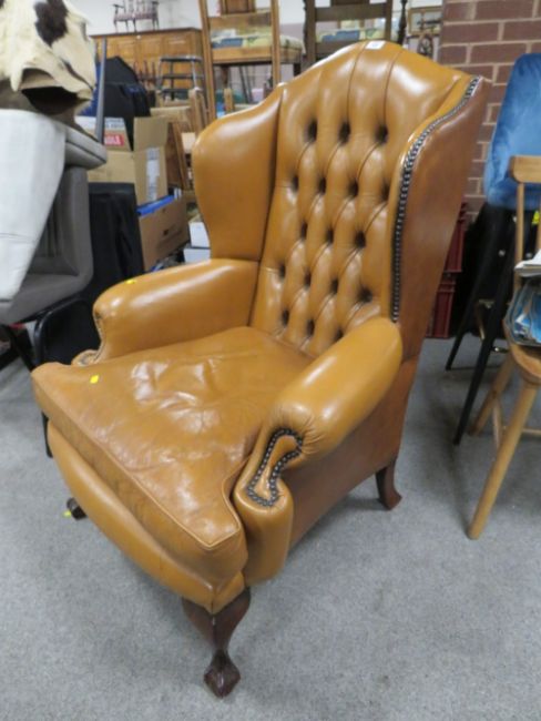 AN ANTIQUE STYLE BROWN LEATHER WINGBACK ARMCHAIR