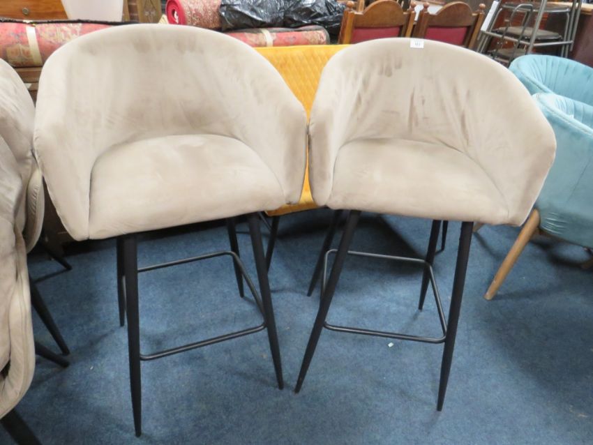 A PAIR OF MODERN UPHOLSTERED VELVET BAR / KITCHEN STOOLS