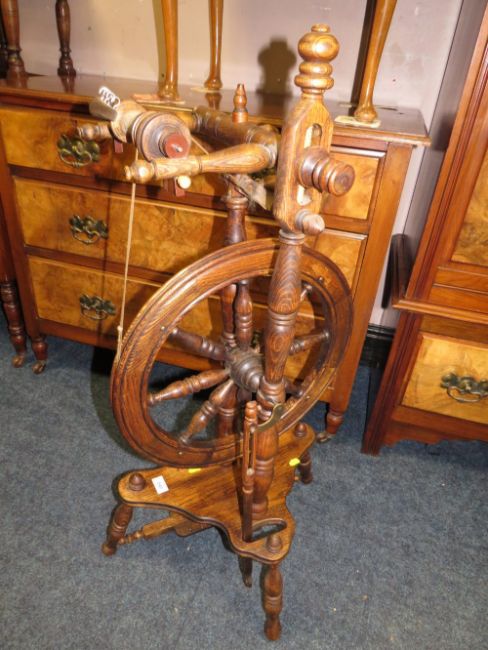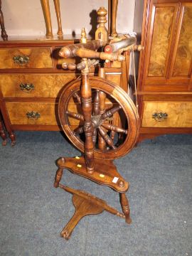 A REPRODUCTION OAK SPINNING WHEEL